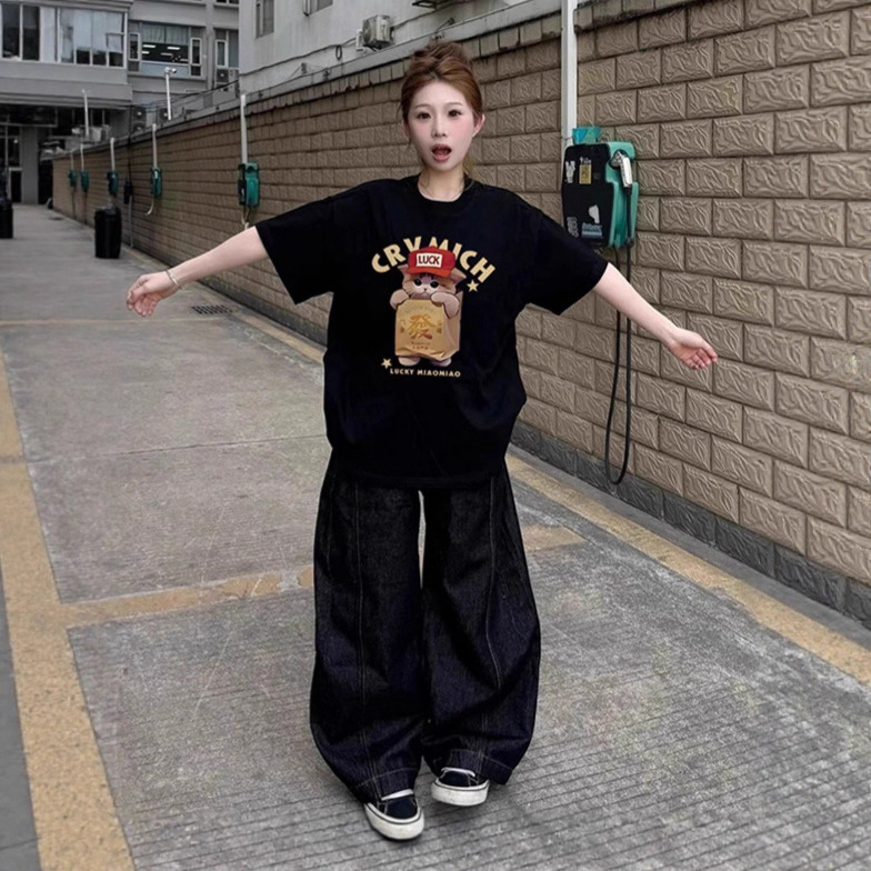 200 グラム純綿国民トレンド猫プリント大きいサイズ半袖 Tシャツ女性のための 2025 夏ルーズカジュアル多用途トップトレンディ