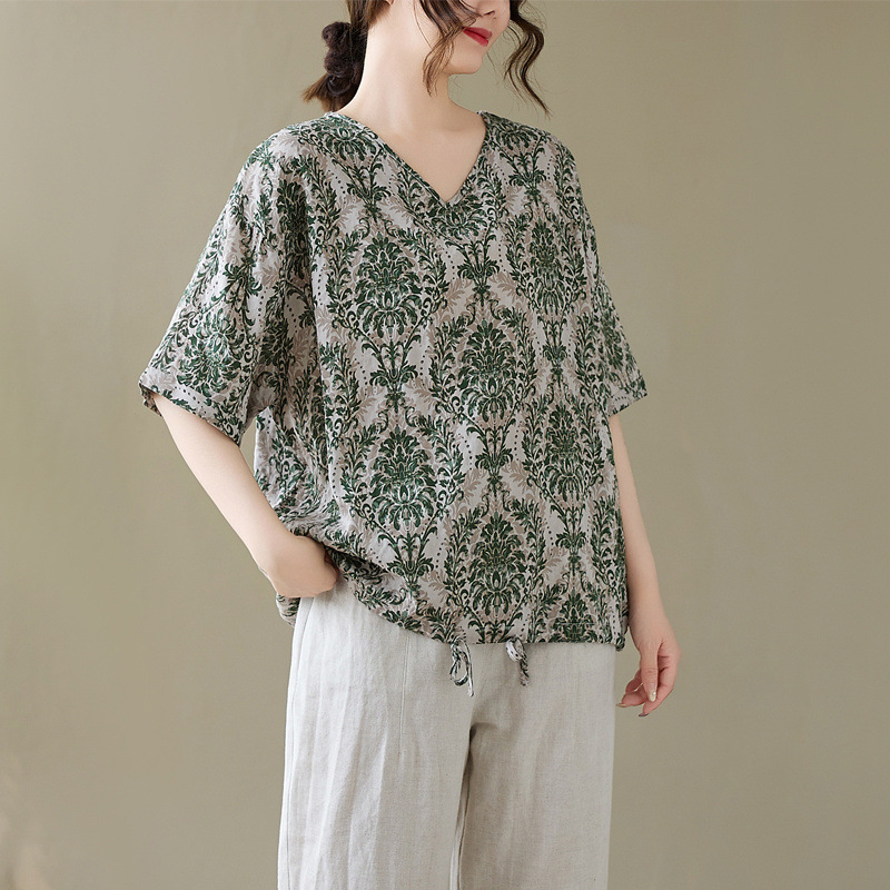 リアルショットスポット・レトロプリントVネックアーティスティックトップスカジュアルルーズ万能半袖綿麻大きいサイズTシャツ女性用