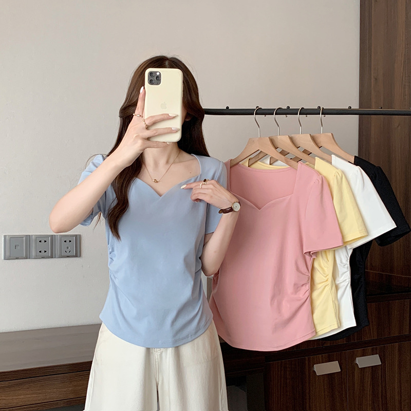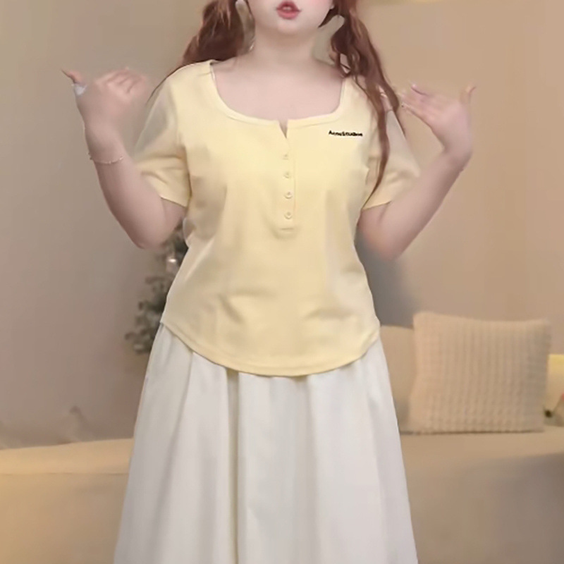 150kg プラスサイズの女性のスクエアネックショルダー半袖 Tシャツ夏の新しいスタイルファット mm カーブした裾痩身トップ