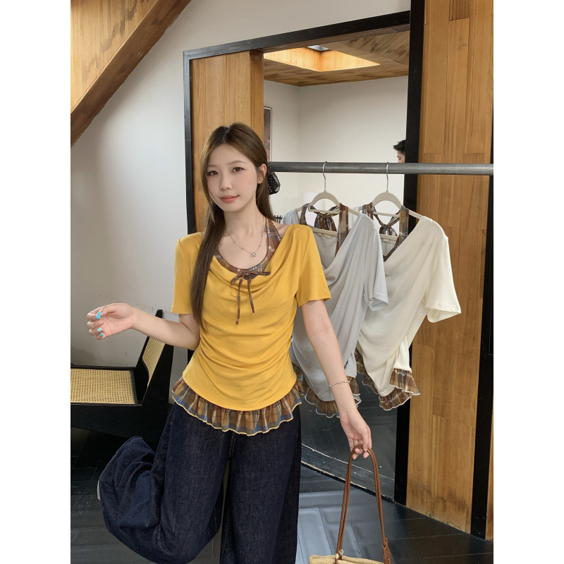 実物写真プラスサイズ夏新デザインバレエスタイルパッチワークフェイクツーピース半袖Tシャツホルタートップ