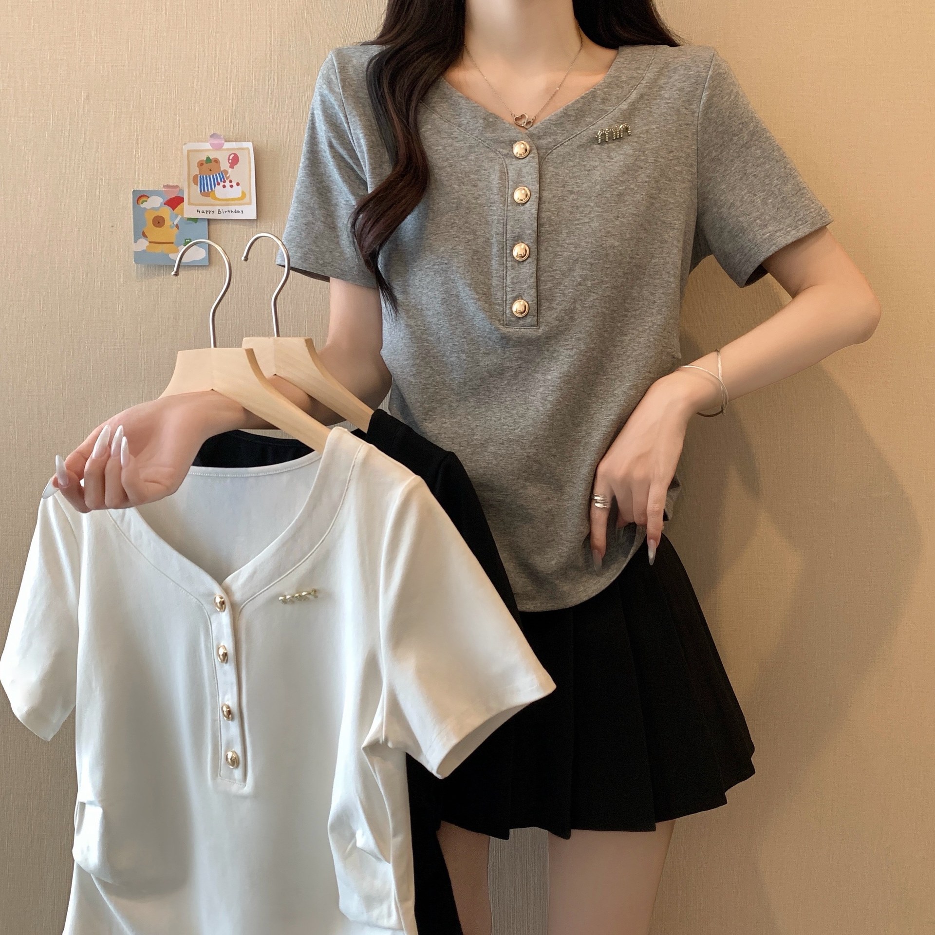 2025 夏綿 Tシャツ半袖大きいサイズの女性のファット m シンプルな V ネックウエスト Tシャツ無地トップ多用途痩身 2528