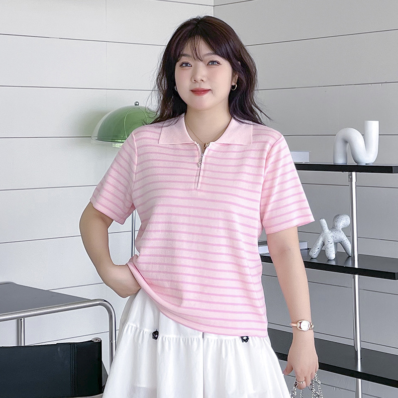 2023 新しい夏の大きいサイズの女性の太った mm 肉をカバー痩身トップストライプ Tシャツラペル半袖セーター