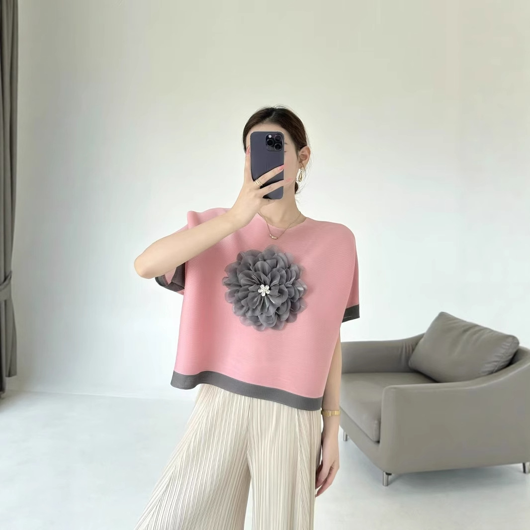 プリーツなし、ファッショナブルでエレガント、立体的な花柄デザイン、スタイリッシュで万能なゆったりとした大きいサイズのTシャツ、年齢を軽減するトップス