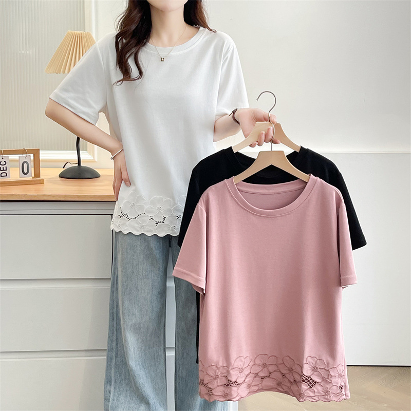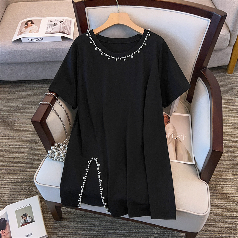 ラウンドネック新スタイルプラスサイズ痩身ルーズミッドレングススリット半袖Tシャツ女性用200/300/350ポンド7111