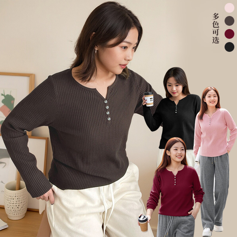 2025アマゾン秋冬の新型純色の大きいサイズの婦人服の上着のvネックの長袖の坑条は毛のtシャツを磨いてゆったりとしています。