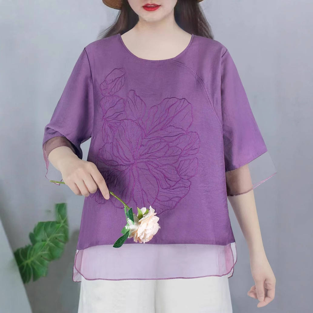 女性用大きいサイズのシルクとリネンのトップス、半袖、夏スタイル、芸術的でレトロな刺繍入り、ゆったりとした痩身トップス、Tシャツの実物写真