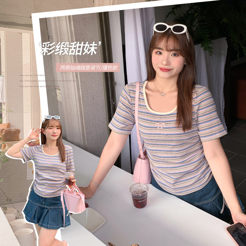 蝶の刺繍のストライプの短いタイプのtシャツの太っているmmの大きいサイズの小さい大衆のデザイン感の甘いギャルの包帯の半袖の上着の62629