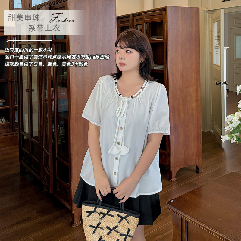 Shuangtian 2025 新しい夏スタイルファットシスター大きいサイズの婦人服 100kg スイートビーズレースアップトップ 9000
