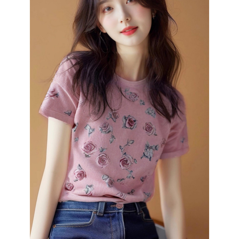 夏の甘い大衆独特の独特な紫色のバラの正肩の丸首の高品質の小さい上着の半袖のシャツの女性の夏