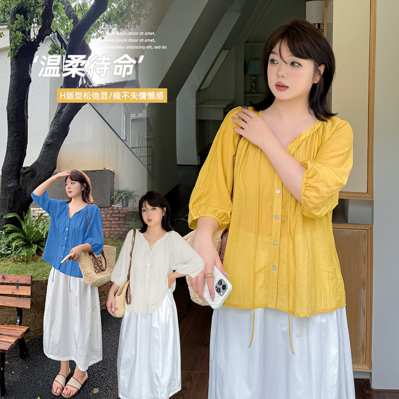 Shuangtian プラスサイズの女性のファット mm 夏 2025 新しい 100kg ジャケットラウンドネックランタンスリーブブラウス 8996