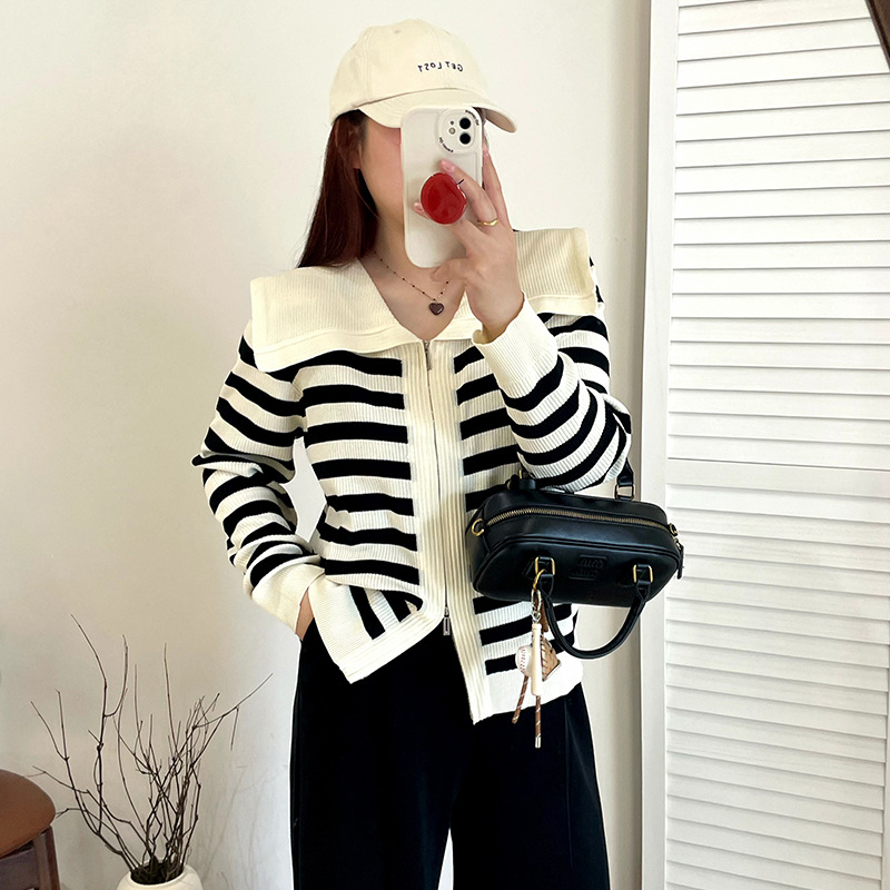 プラスサイズの女性の 2025 秋ネイビーカラージャケットトップス太った女の子のためのストライプ長袖ニットカーディガン女性 21765