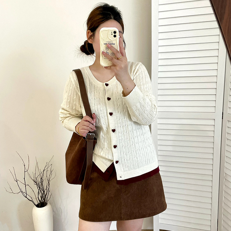 200斤の大きいサイズの女装ファッションの甘いニットのカーディガンのコート2025春の新型の丸首のデザイン感のセーター