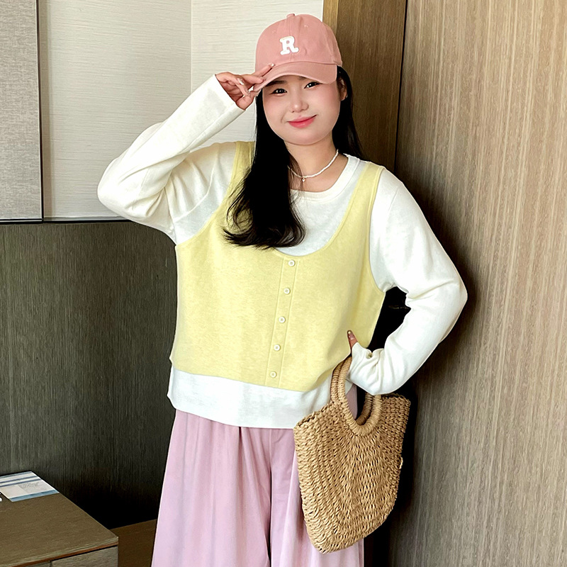 繊莉秀の大きいサイズの婦人服の韓系の優しい風のシンプルな丸首は色の偽の2つのセーターにぶつかります。