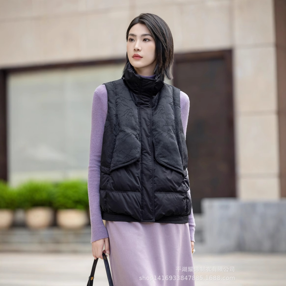 羽毛のベストの女性は秋冬外着です。
