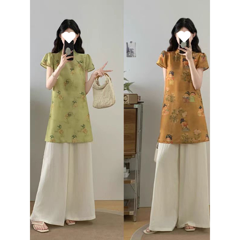 2025 新しい大きいサイズのハイエンドの新しい中国風のスーツ女性の夏のボタンチャイナトップファット MM 痩身ワイドレッグパンツ