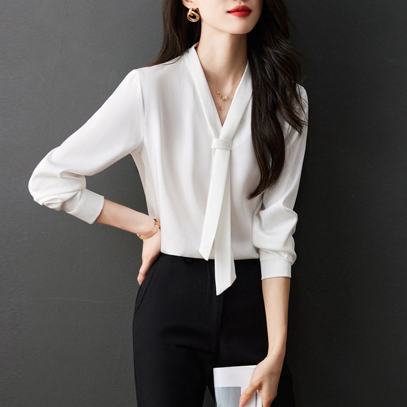 CS163 大きいサイズ女性用仕事面接用ワークウェアインナー着用 太め体型MM向け長袖シフォンネクタイ付きシャツトップス