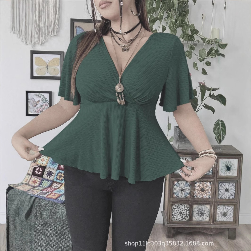 2025越境アマゾン新欧米シフォンレディースプルオーバー大きいサイズルーズVネック七分袖シャツトップス