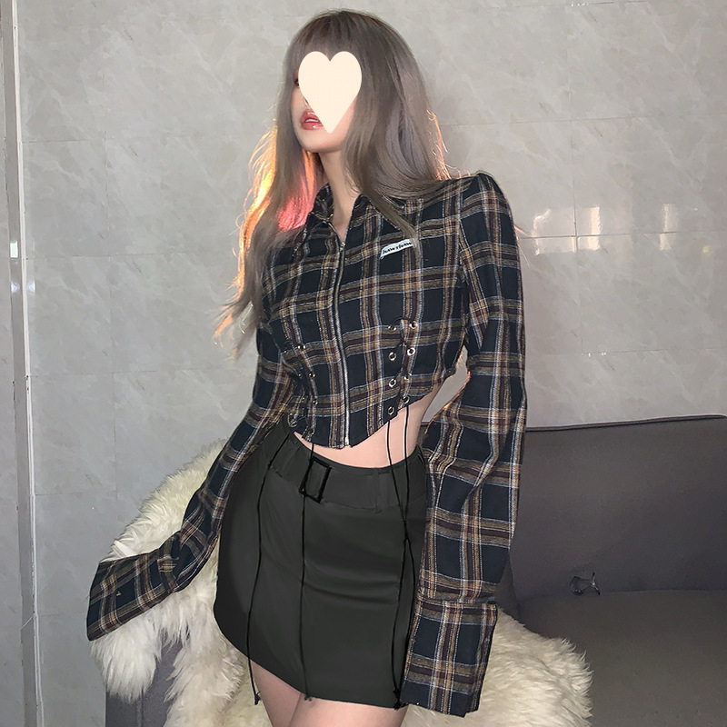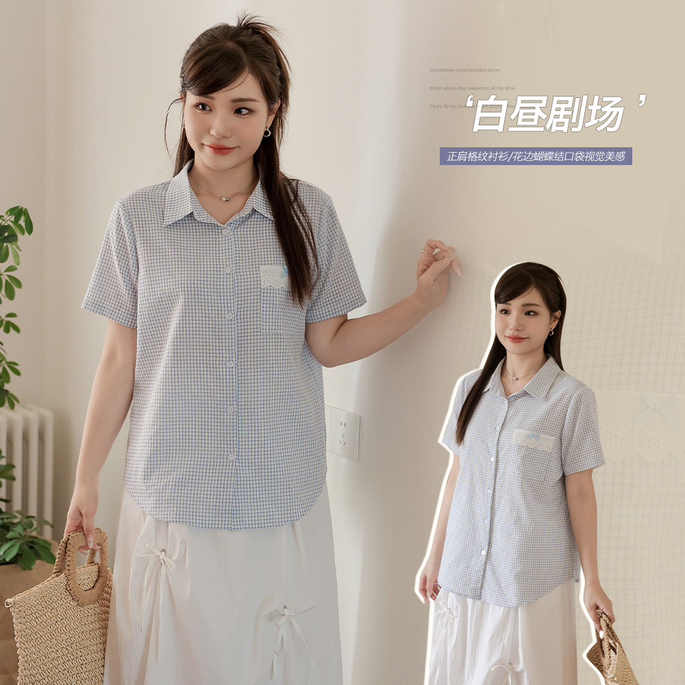 韓国風ルーズラペルショルダーリボンチェック柄トップスゆったり着痩せ万能ファットmm大きいサイズシャツ65234