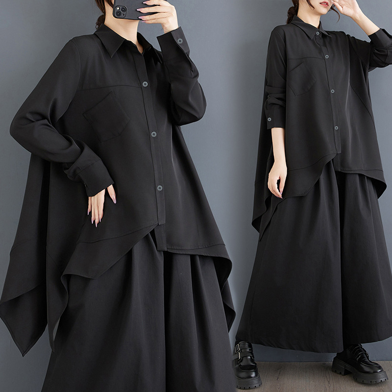2025春秋の新型韓国版暗黒の不規則なファッションのゆったりした大きいサイズの長いシャツ
