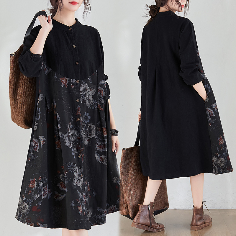2025年秋の新作韓国風ゆったり大きいサイズ長袖気質スプライシングプリント綿麻ボトムシャツスカート女性用の実物写真