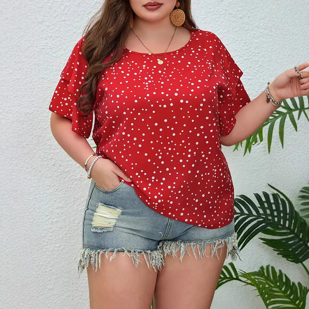 2025 新しいアマゾン独立系ステーションクロスボーダープラスサイズ婦人服ヨーロッパとアメリカのカジュアルホリデースタイル蓮の葉袖ドットパターン