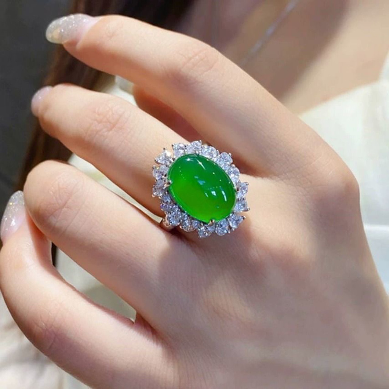 天然冰透绿玉髓玛瑙复古气质满钻开口戒指女 椭圆形蛋面指环饰品