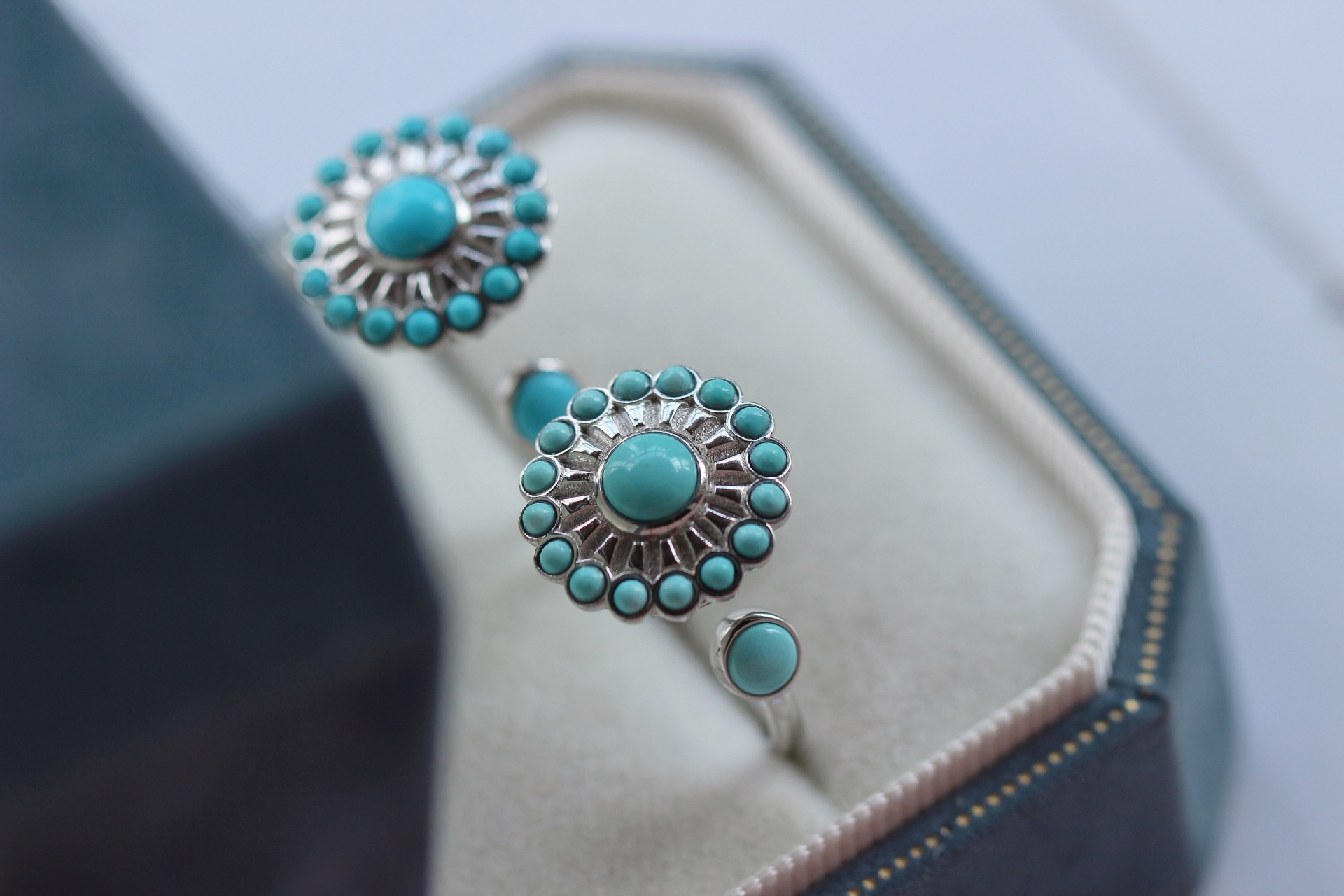 天然原鉱湖北緑松石時に指輪の面盤を運転して回転できるs925銀モザイク高磁器青