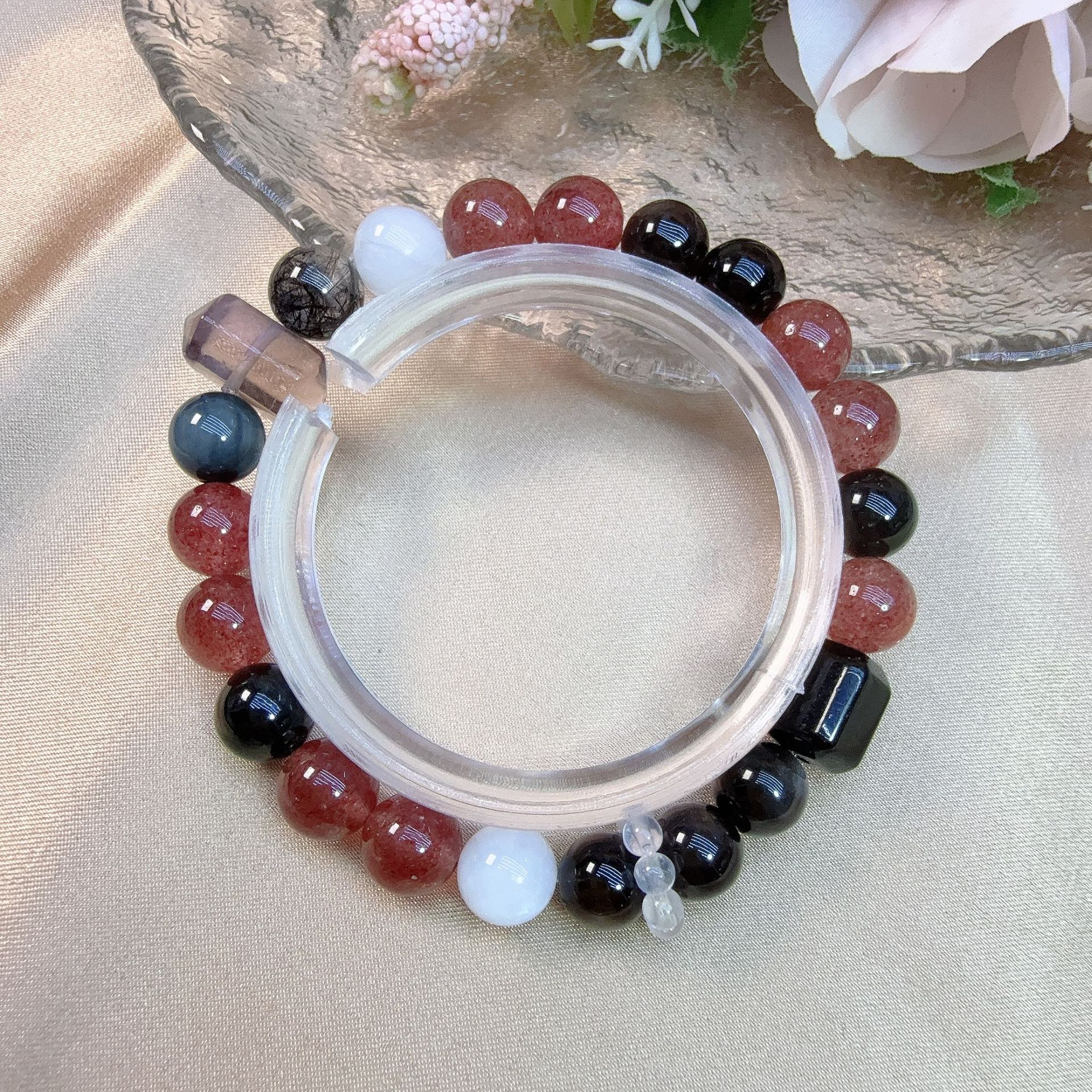天然シルバーオブシディアン、ストロベリークォーツ、ブルームーンライト、イーグルアイ、ブラックヘアクリスタル、アメジストのダブルポイントライトラグジュアリーブレスレット S0474