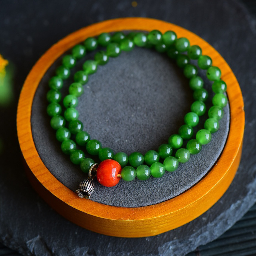 天然の古い坑のロシアの材料の碧玉のブレスレットの6mmの玉のみずみずしくて繊細な超艶のほうれん草の緑の2回転のバラのペンダントのブレスレット