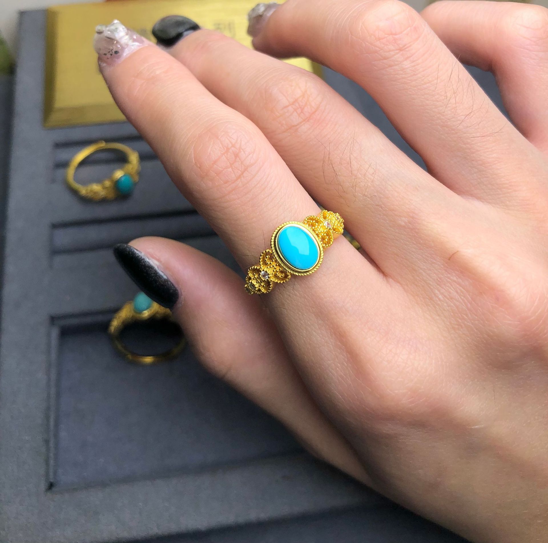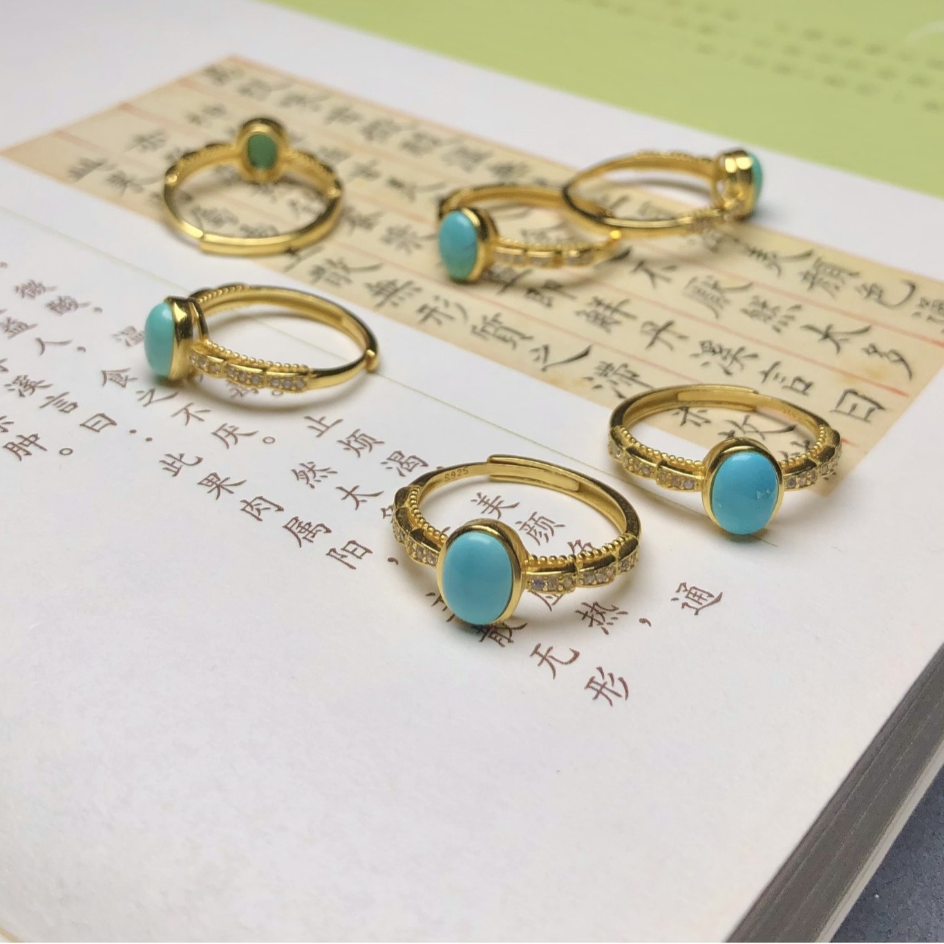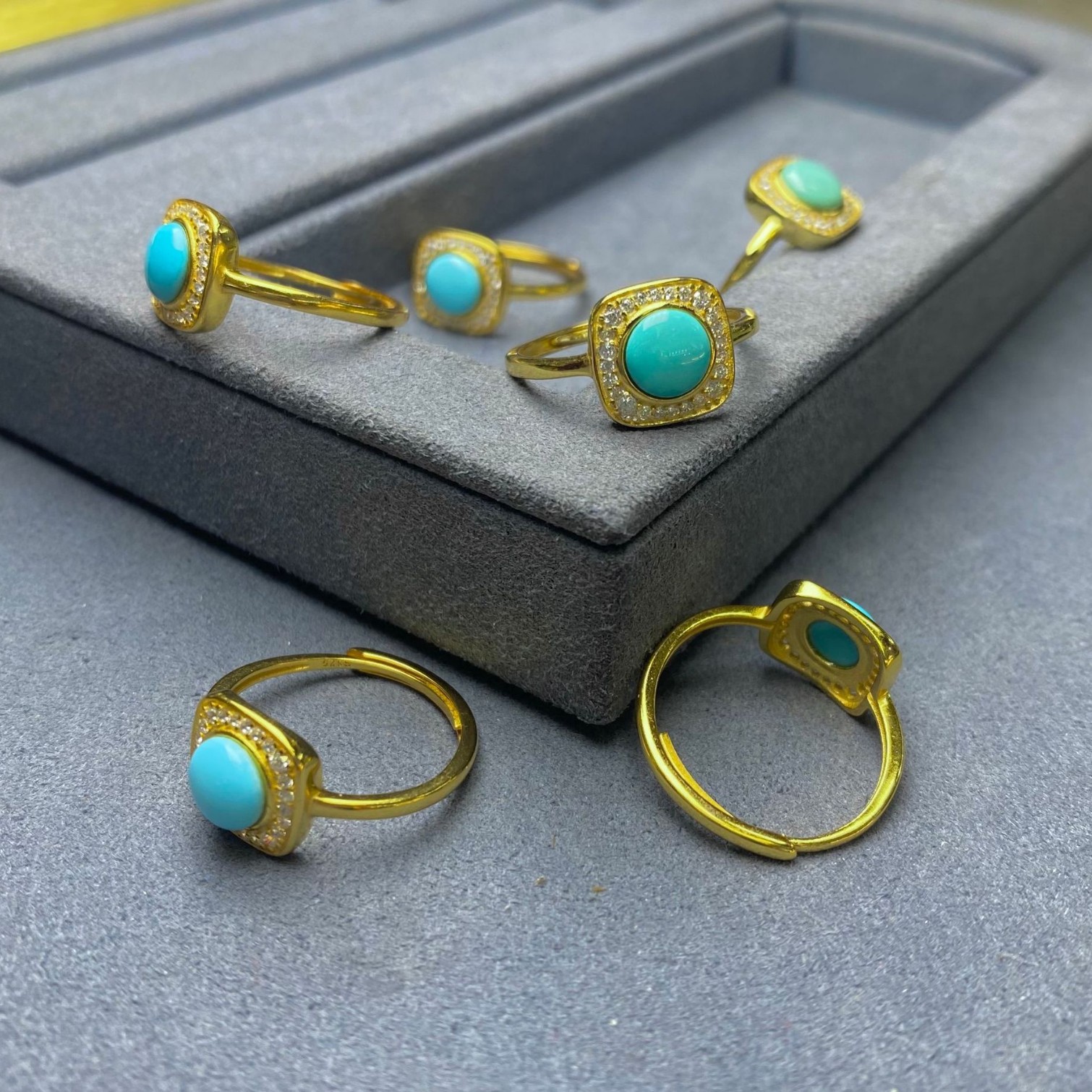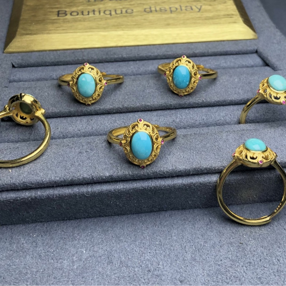 S925シルバー純銀に24K本金メッキを施し、天然原石ターコイズを象嵌した、清涼感のある高級感のある女性用リング(証明書付き)