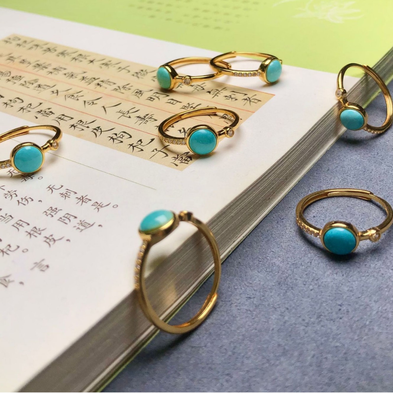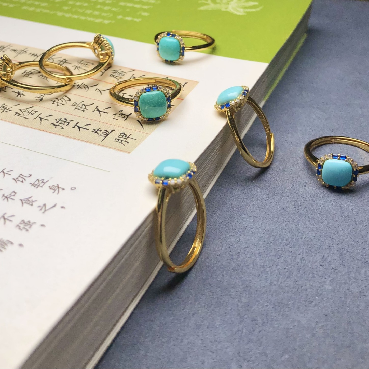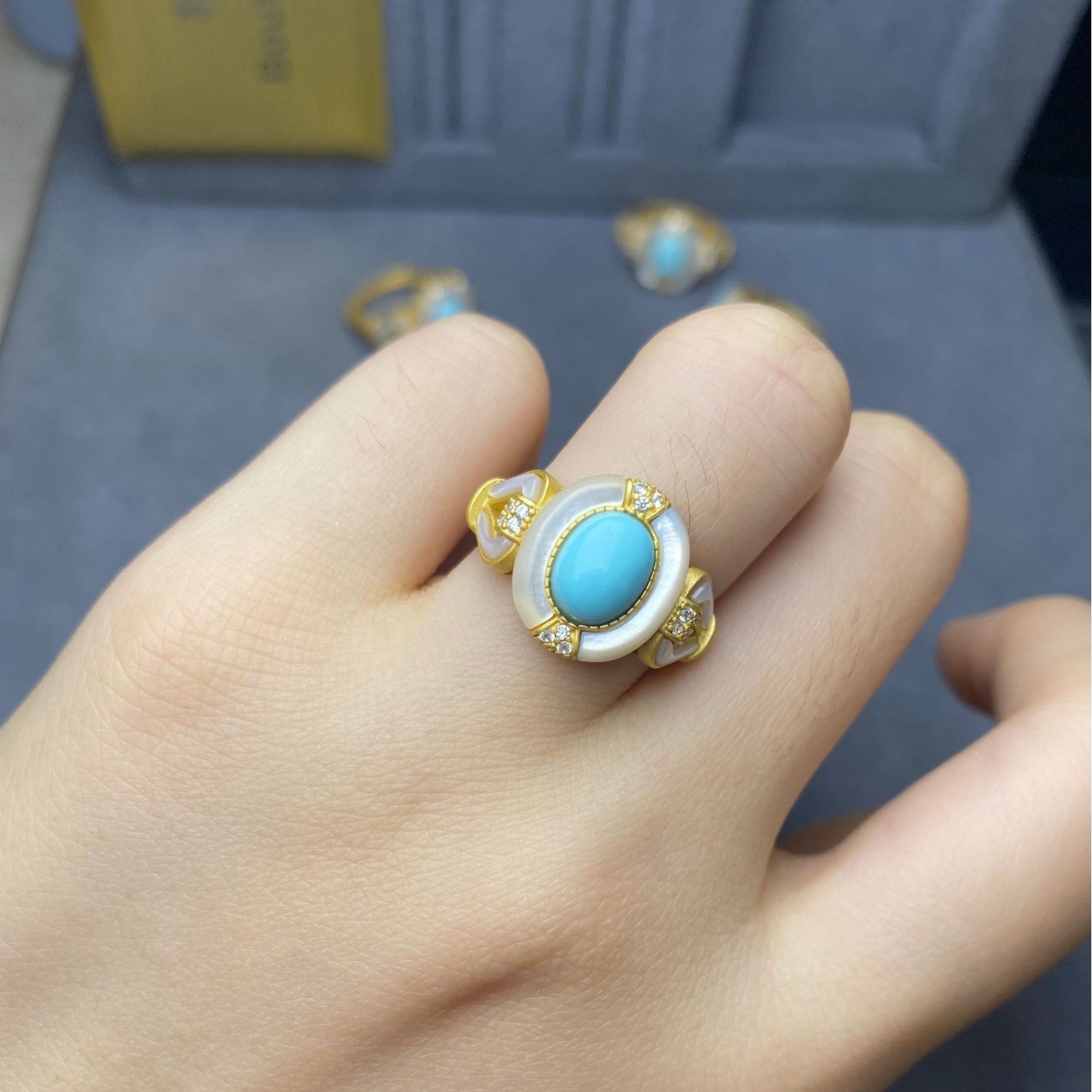 S925シルバー純銀に24K本金メッキを施し、天然原石ターコイズを象嵌した、清涼感のある高級感のある女性用リング(証明書付き)