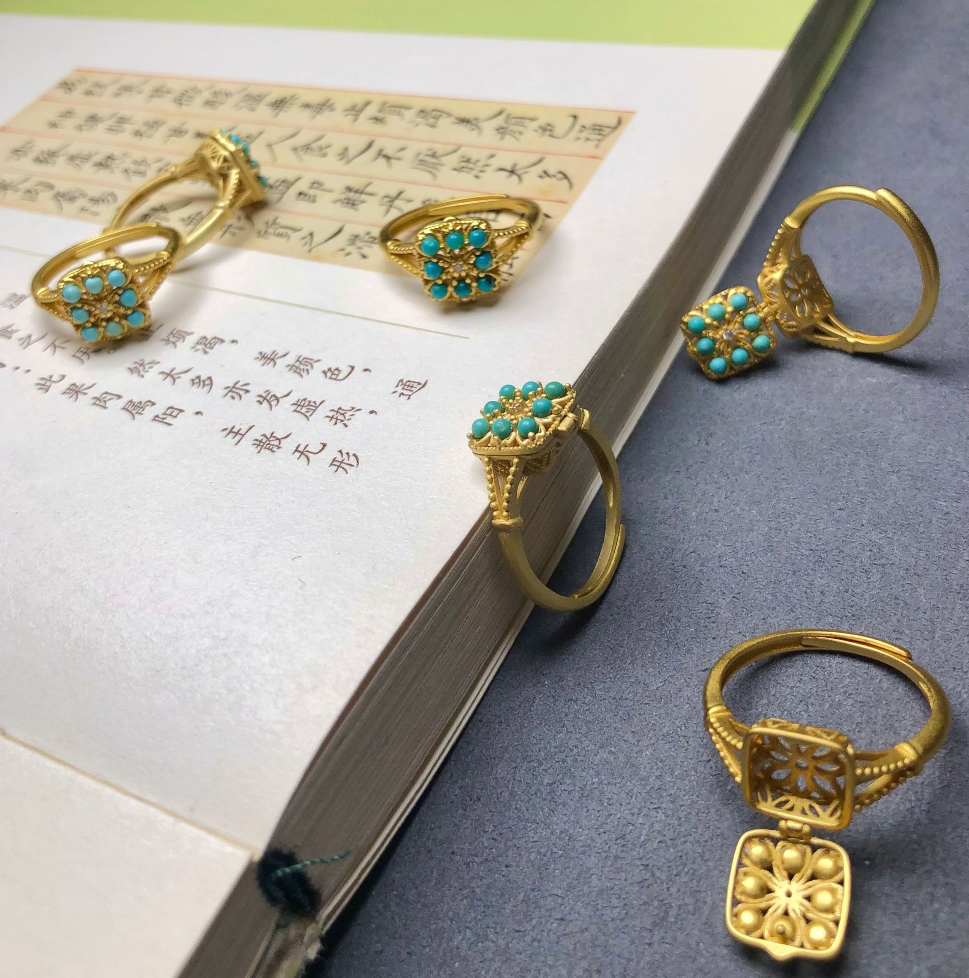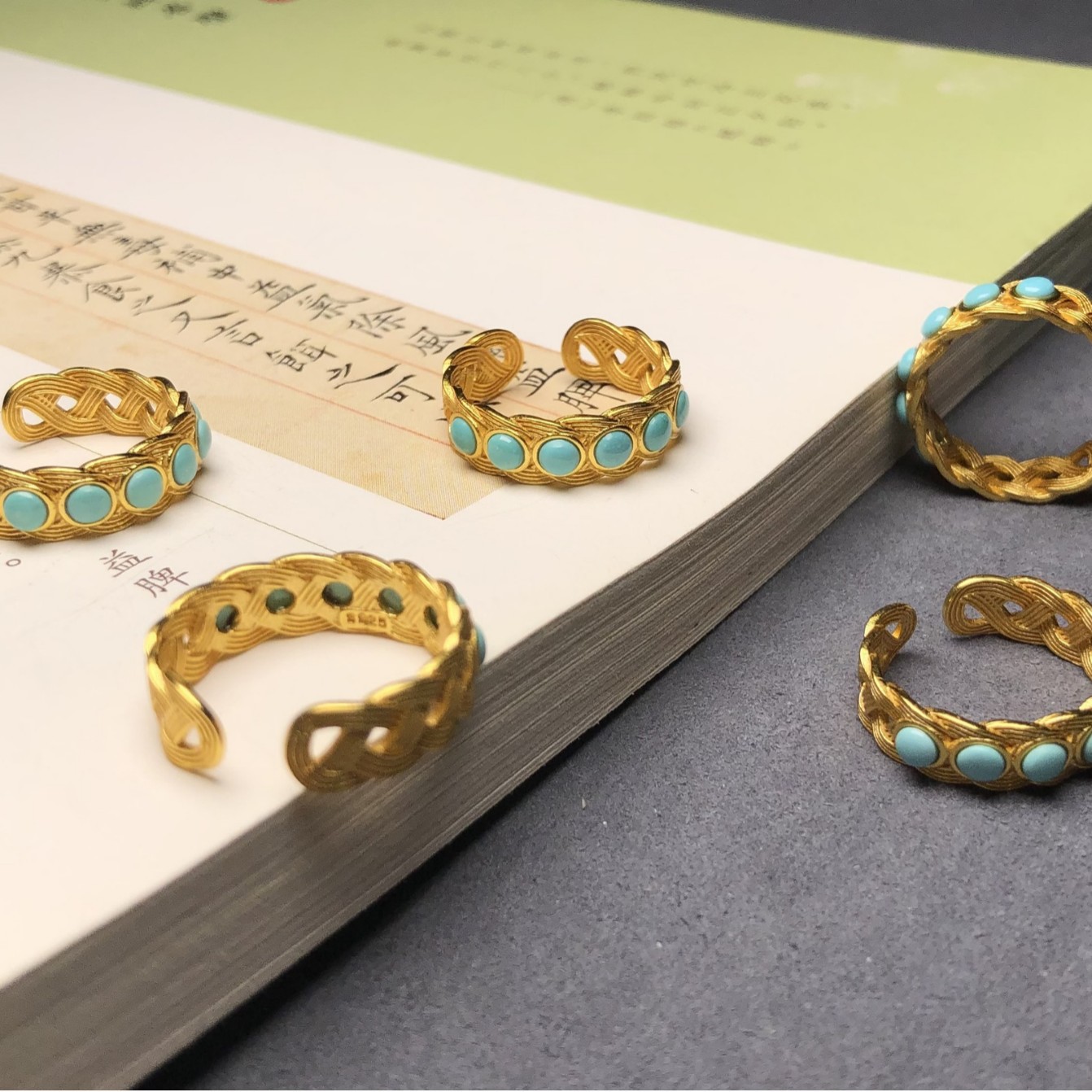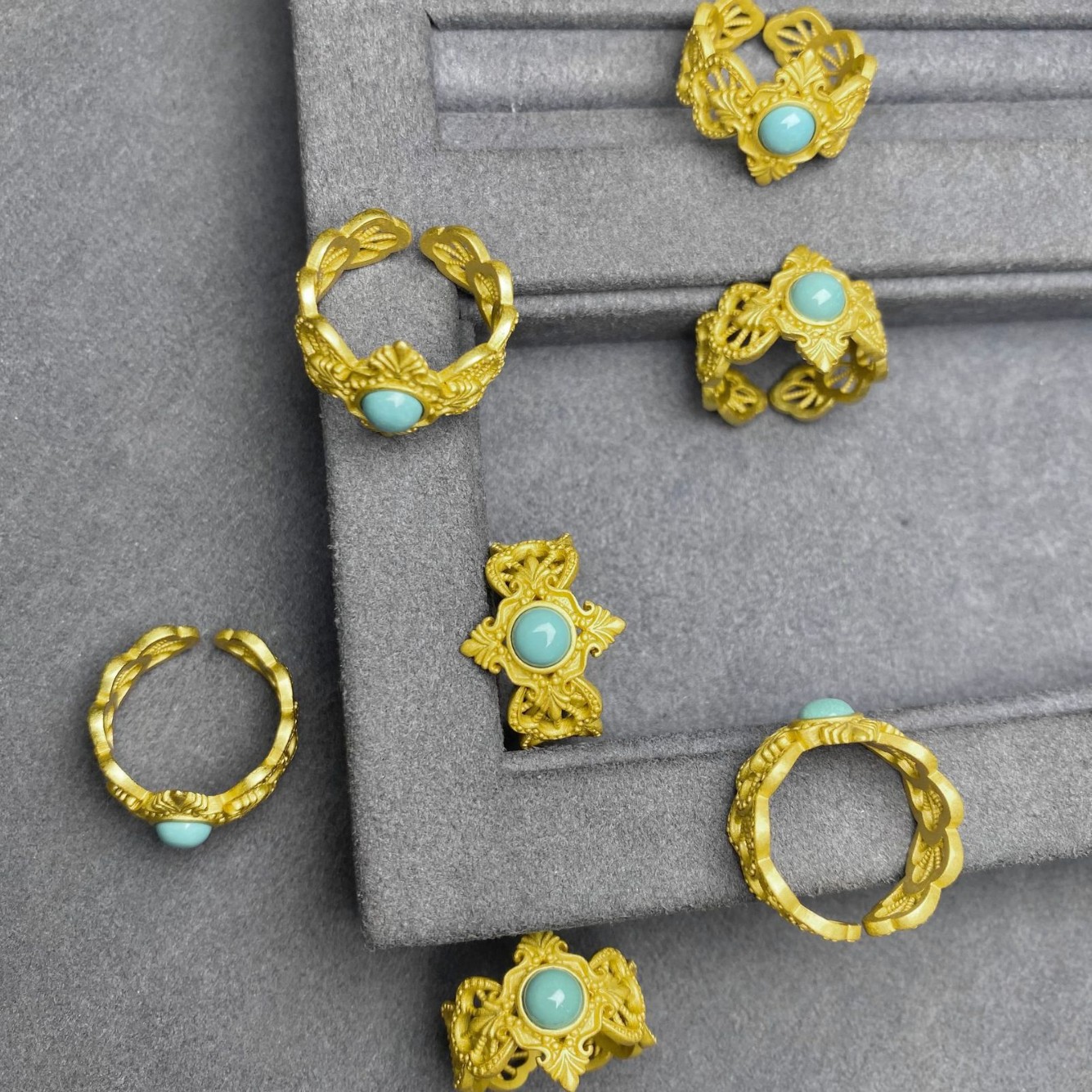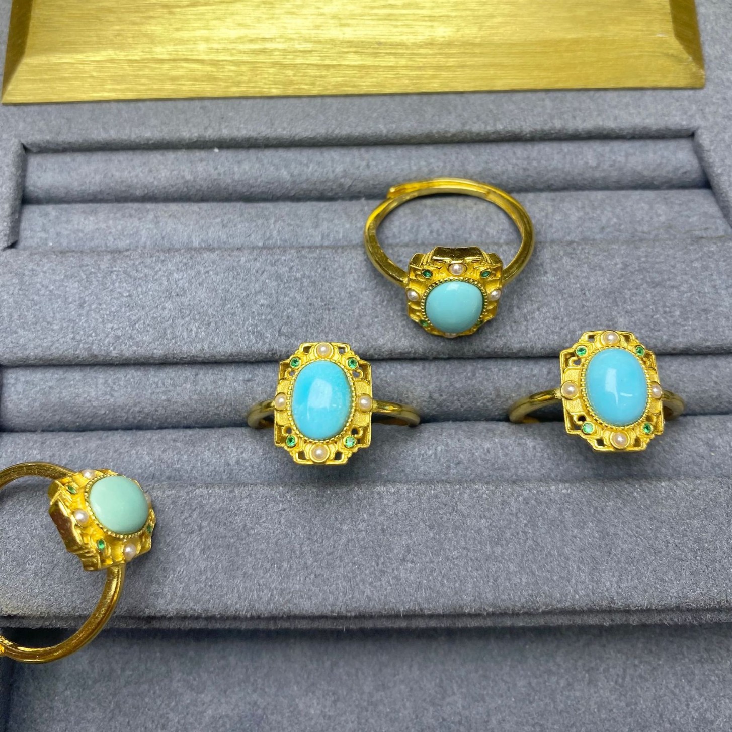 北原鉱石ターコイズ S925 シルバー 24K リアルゴールドメッキ、精密インレイ、中国宮殿スタイルのリング