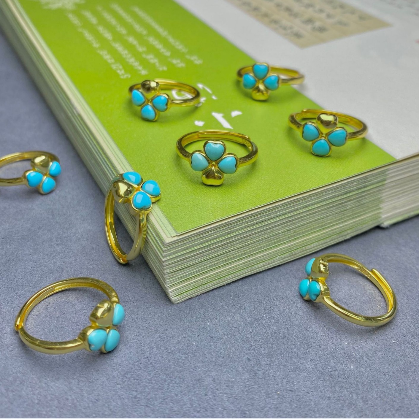 湖北原石ターコイズ S925 シルバー 24K リアルゴールドメッキ、精密インレイ、新鮮な四つ葉のクローバー リング