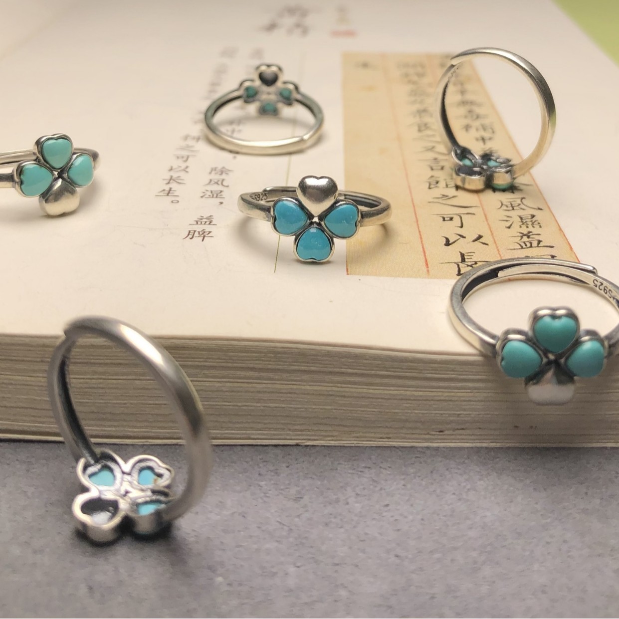湖北原石ターコイズ S925 シルバー精密象嵌フレッシュクローバーリング