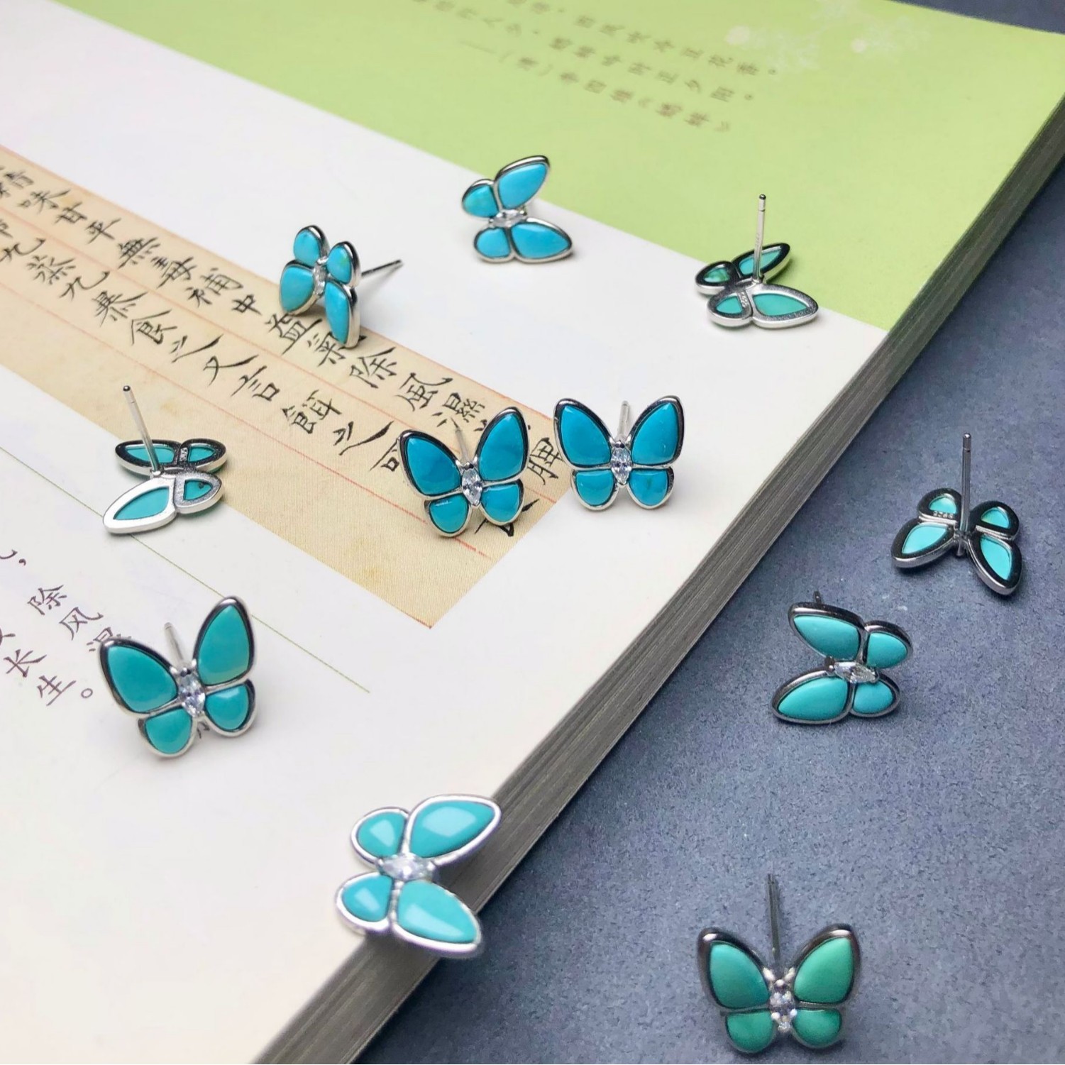 湖北原石ターコイズ S925 シルバー、細かい象嵌、ファッショナブルな気質の蝶のイヤリング