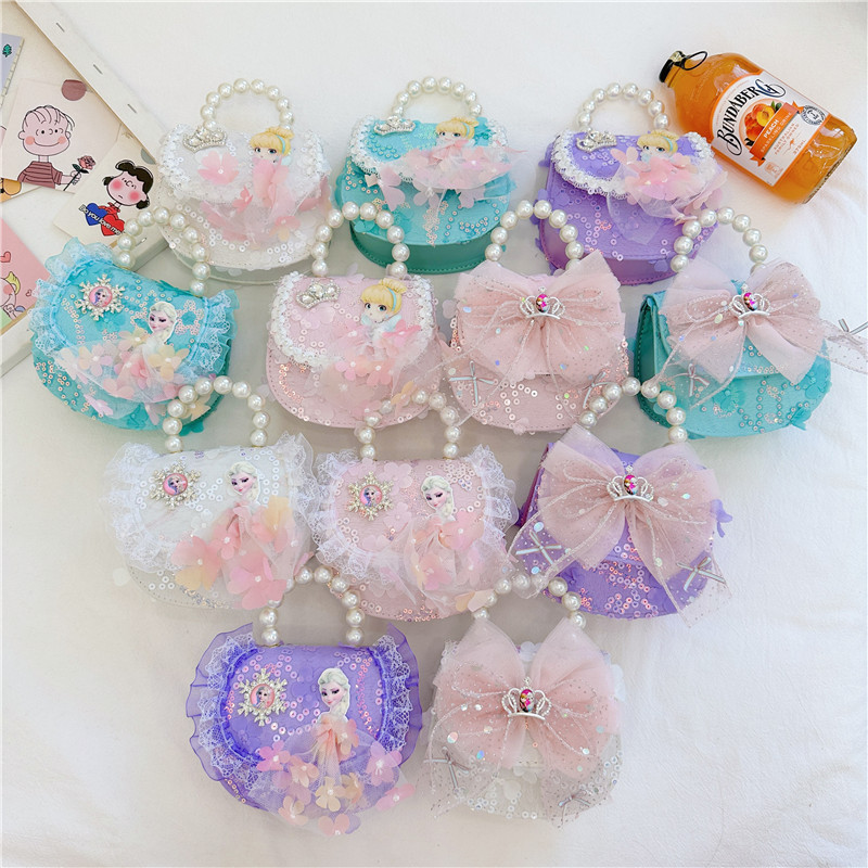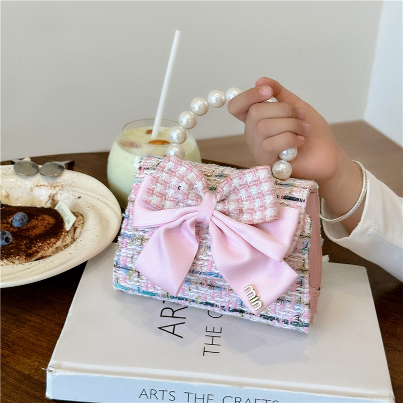 2023秋冬新作子供気质プリンセスパールハンドバッグ蝶結びレースチェーン小銭片ショルダーバッグ