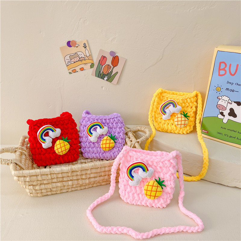 子供の手作りの毛糸を編む女の子のショルダーバッグが可愛いです。