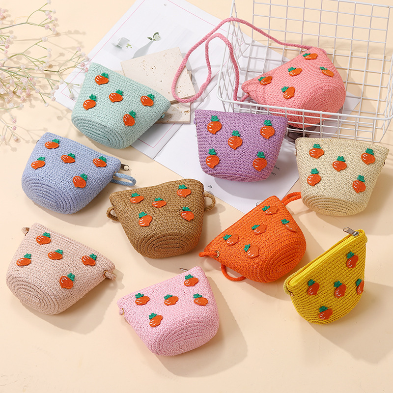 子供用織バッグ女性の夏かわいいキャロット海辺わらバッグ休暇女の子クロスボディバッグミニ小銭入れ