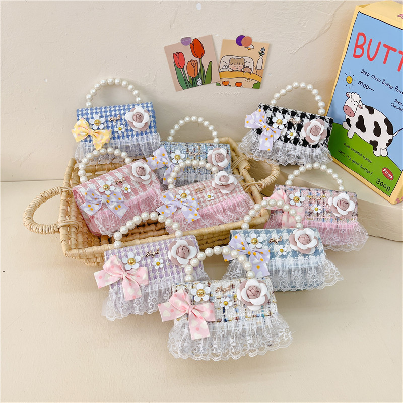 卸売かわいい子供の真珠のハンドバッグファッションレースの弓漫画チェーン斜め小さなバッグプリンセス財布