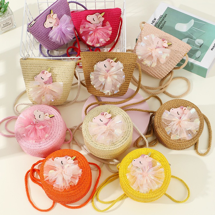 かわいい編み草編みバッグ2024新型子供バッグ女性斜め掛け夏海辺ビーチ休暇小銭入れ