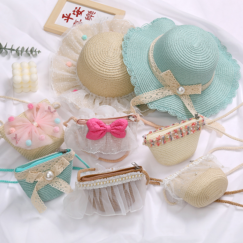 子供用レース蝶結び草バッグ編みバッグ女の子片肩斜め掛け小銭入れ可愛い夏帽子麦わら帽子