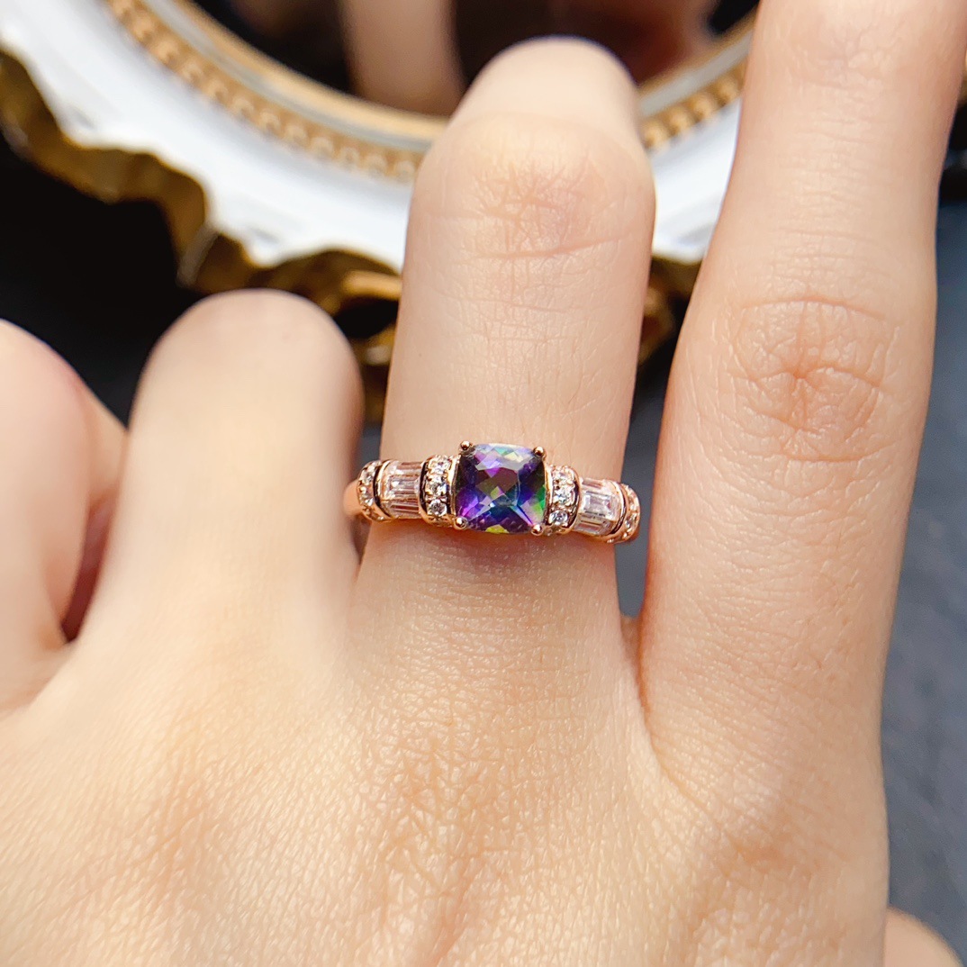 新天然七彩水晶指輪S925銀モザイク主石5*5mm百合ネット赤爆金女飾り卸売り