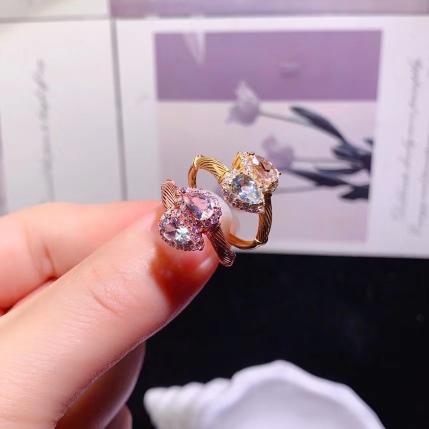 新天然粉トパ指輪S925銀モザイク主石4*6mm百合ネット赤爆金女飾り