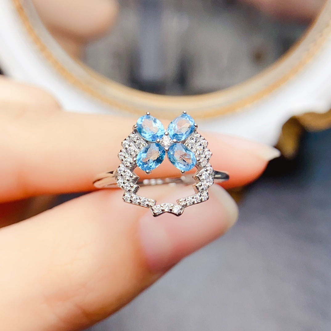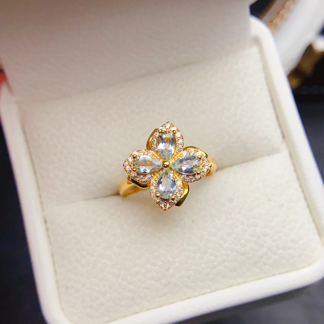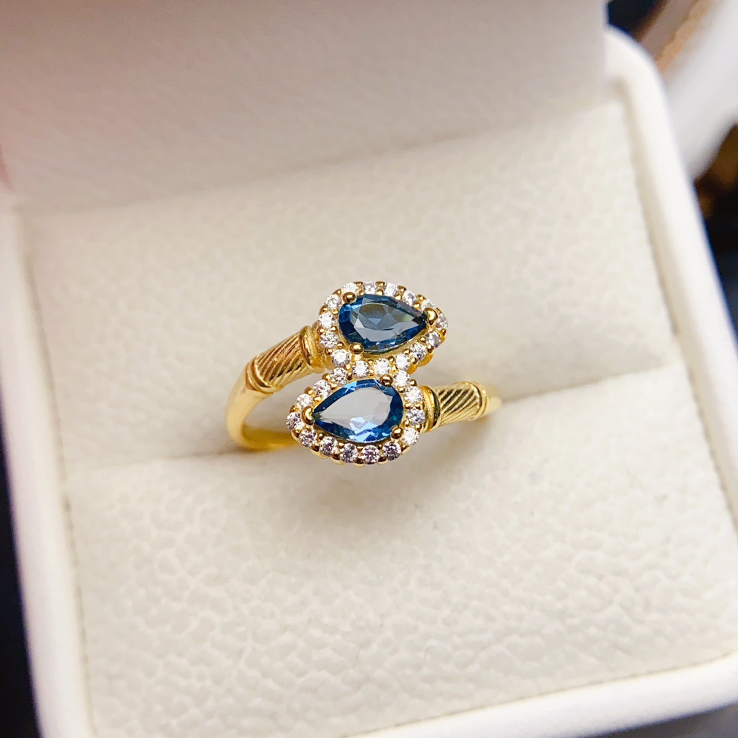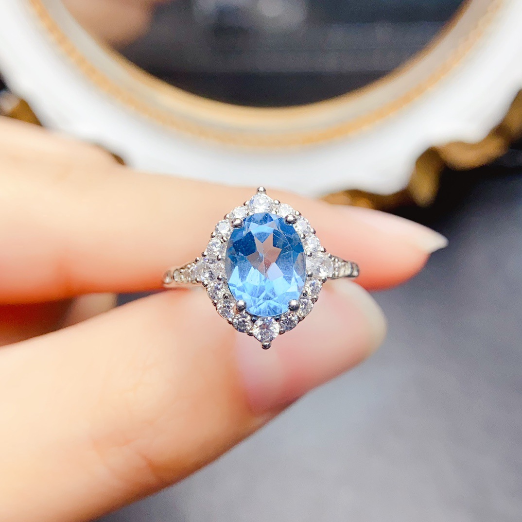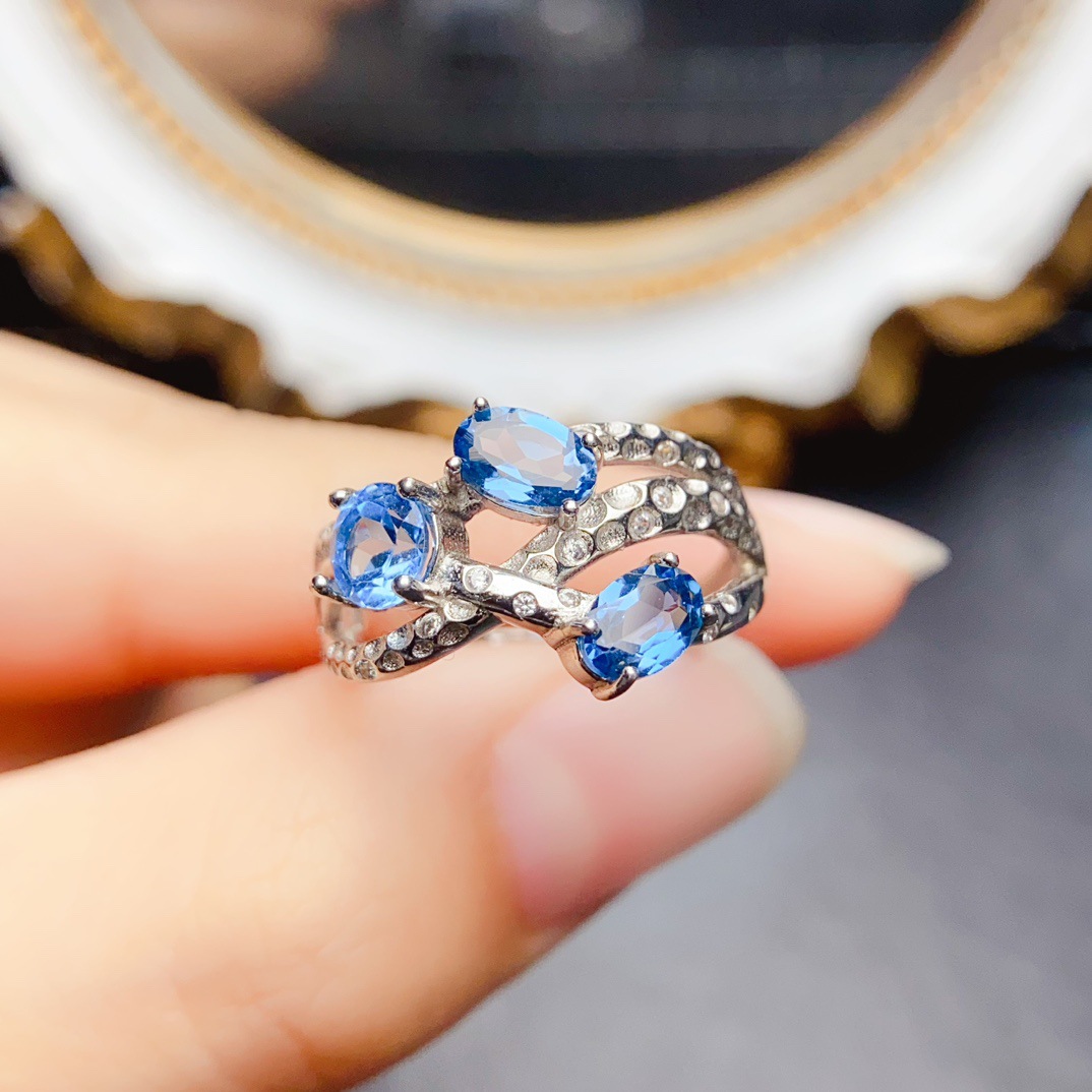 新天然海藍宝指輪S925銀モザイク主石4*6mm百合ネット赤爆金女飾り卸売り