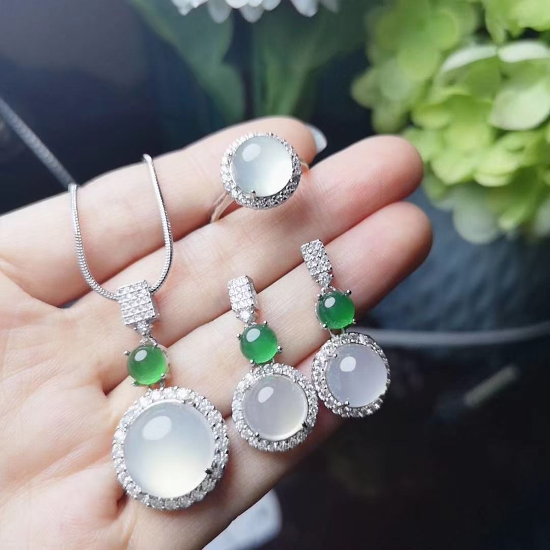 カルセドニーセット卸売アイスジェイドペンダントネックレスイヤリングリングブレスレット翡翠高級グリーンカルセドニー4点セット