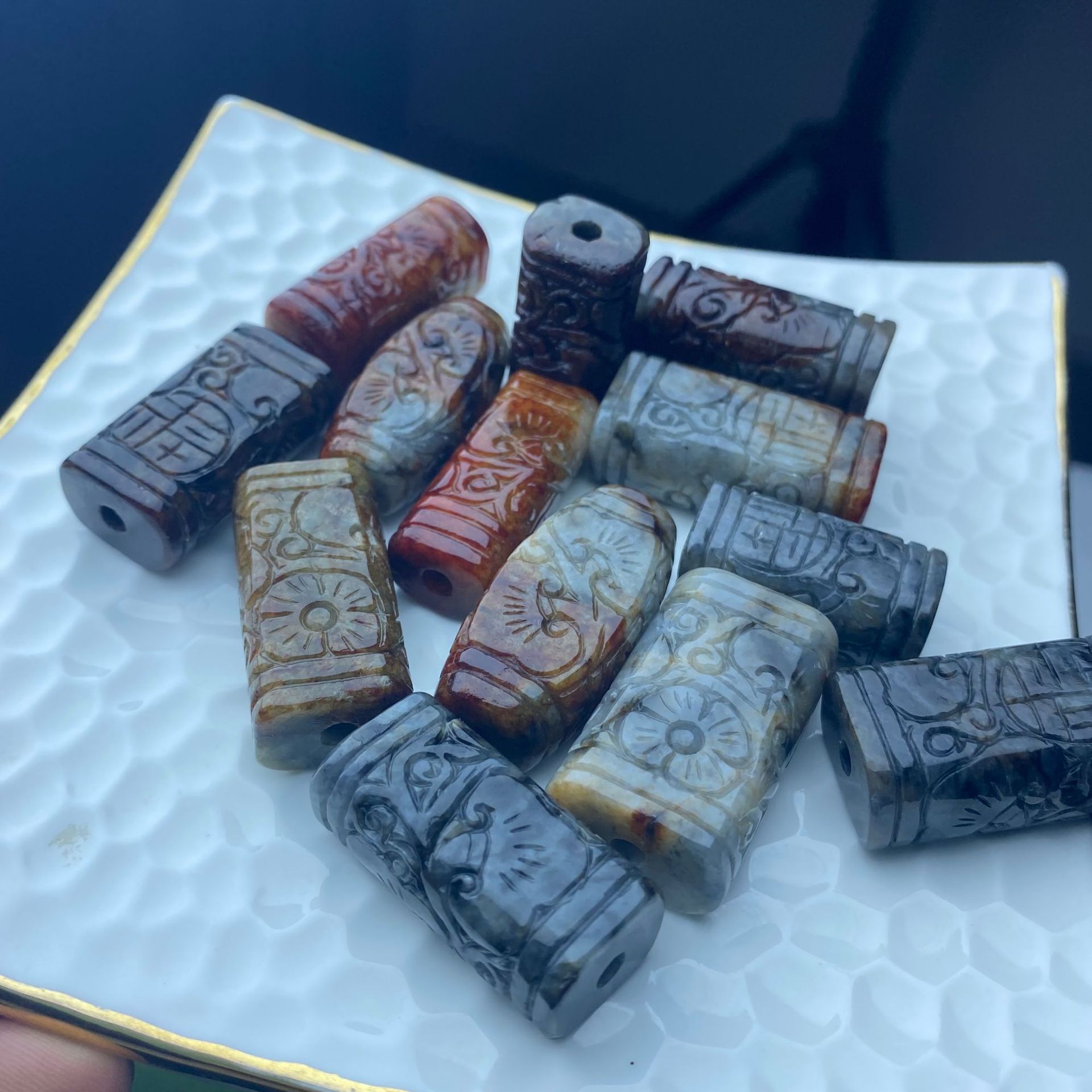 天然翡翠乌鸡飘花红翡烧红雕花如意雕刻桶珠项链配饰手串文玩配件