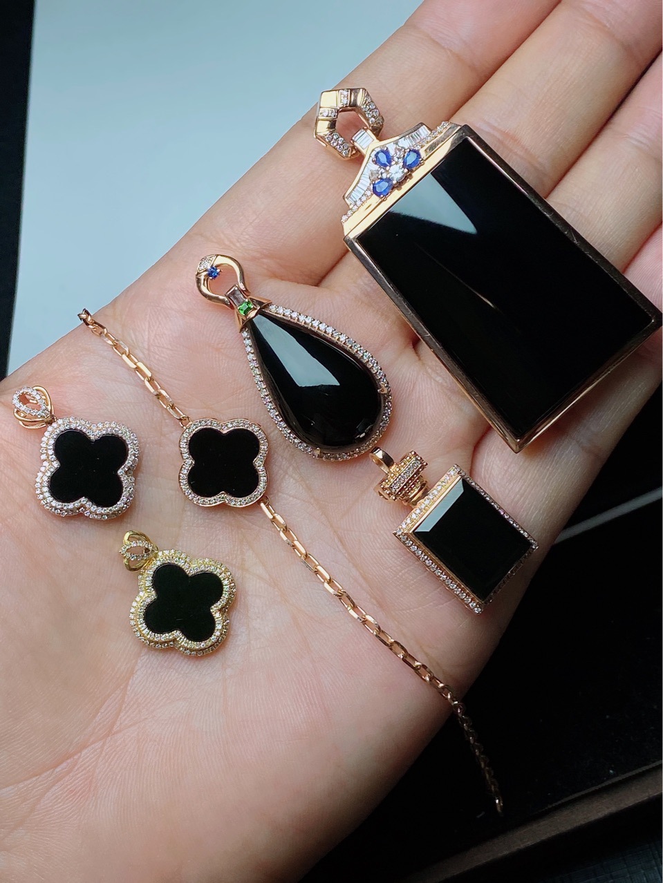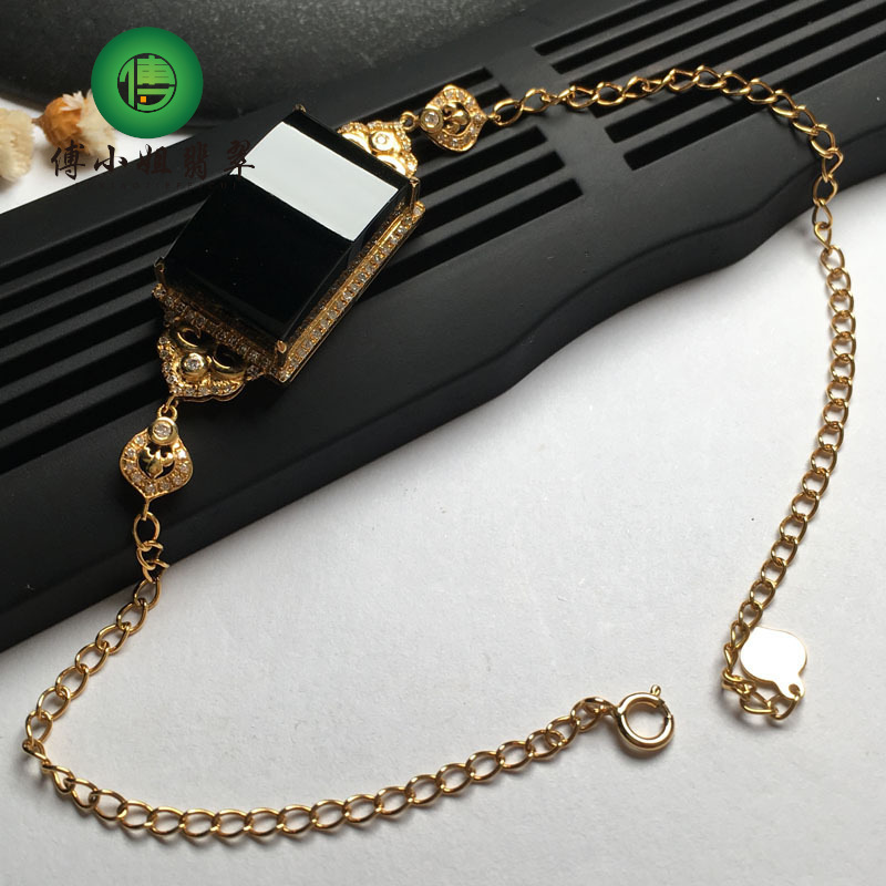 フーさん翡翠墨翠ブレスレット、キーボード黒、明かりが透き通って、18k金伴ドリルがはめ込んでいる