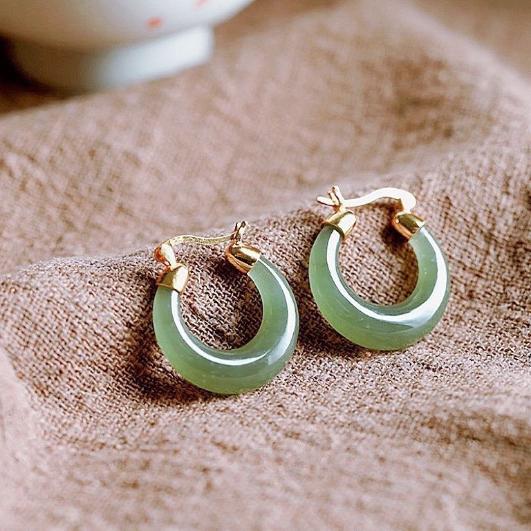 新疆金糸玉東陵玉と田玉のイヤリングの合金は上弦の月の円の耳飾りの復古の気質の女性を象眼します。