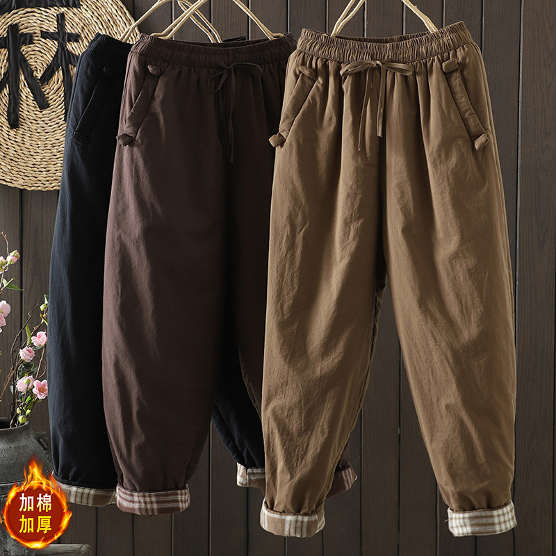 2024冬のレトロなウエストを緩めて、綿のハーレムのズボンの女性の筋肉の純色の厚い綿のズボンの保温のズボンの女性を挟みます。