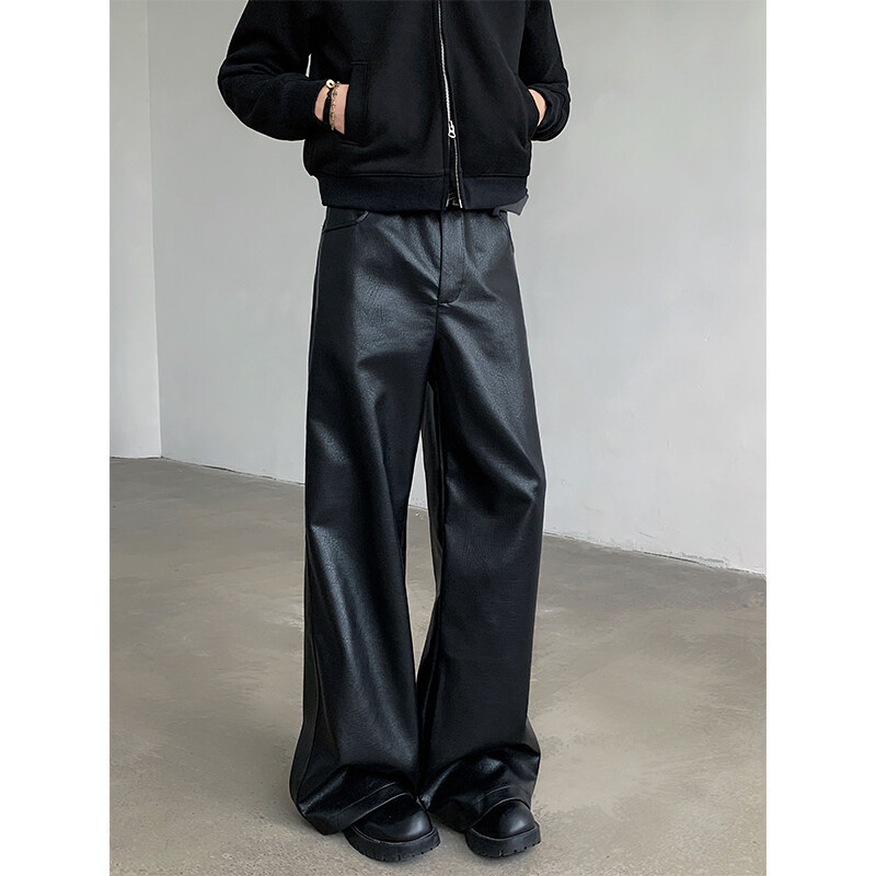 アメリカンクリーンフィットトレンディクールパンクPUレザーパンツメンズルーズマイクロワイドロングパンツ
